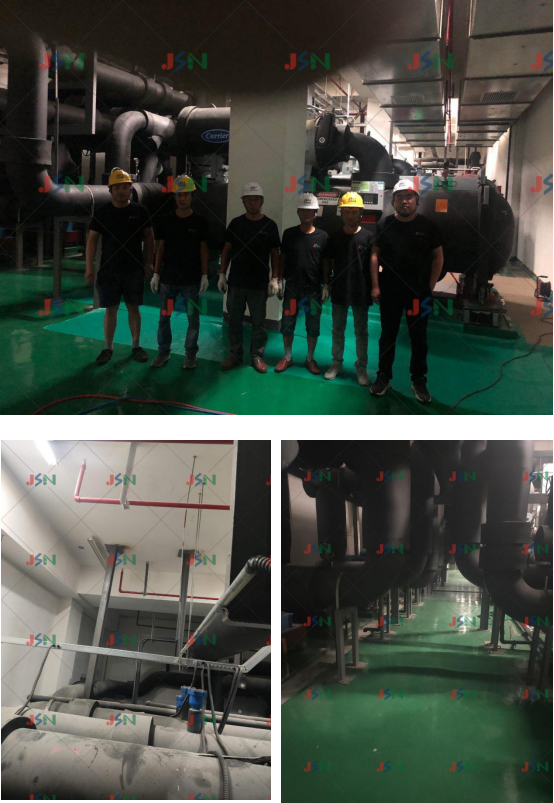 案例簡介:項目現場為工商銀行浙江分行總部大樓,采用框架結構,設備在大廈負一樓有2臺離心式冷水機組、3臺立式水泵機組、 1臺螺桿壓縮機組及有6臺循環水泵相連管道。設備運行在樓上大廳有嚴重的低頻噪音及振感。