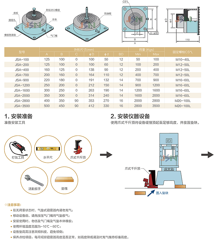 氣壓式防振裝置,符合JISD-4101氣墊耐壓試驗標準,自然頻率3Hz~5Hz,最大使用壓力4.5Kg/cm2。本體采用多層防銹烤漆、Neoprene Rubber,一體成型氣密性佳。防振效果極高,一般設備效率可達97%以上。荷重范圍 50~3500Kg。可加裝防油帽,防止一般油污腐蝕。